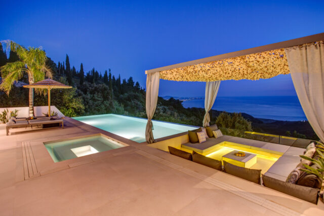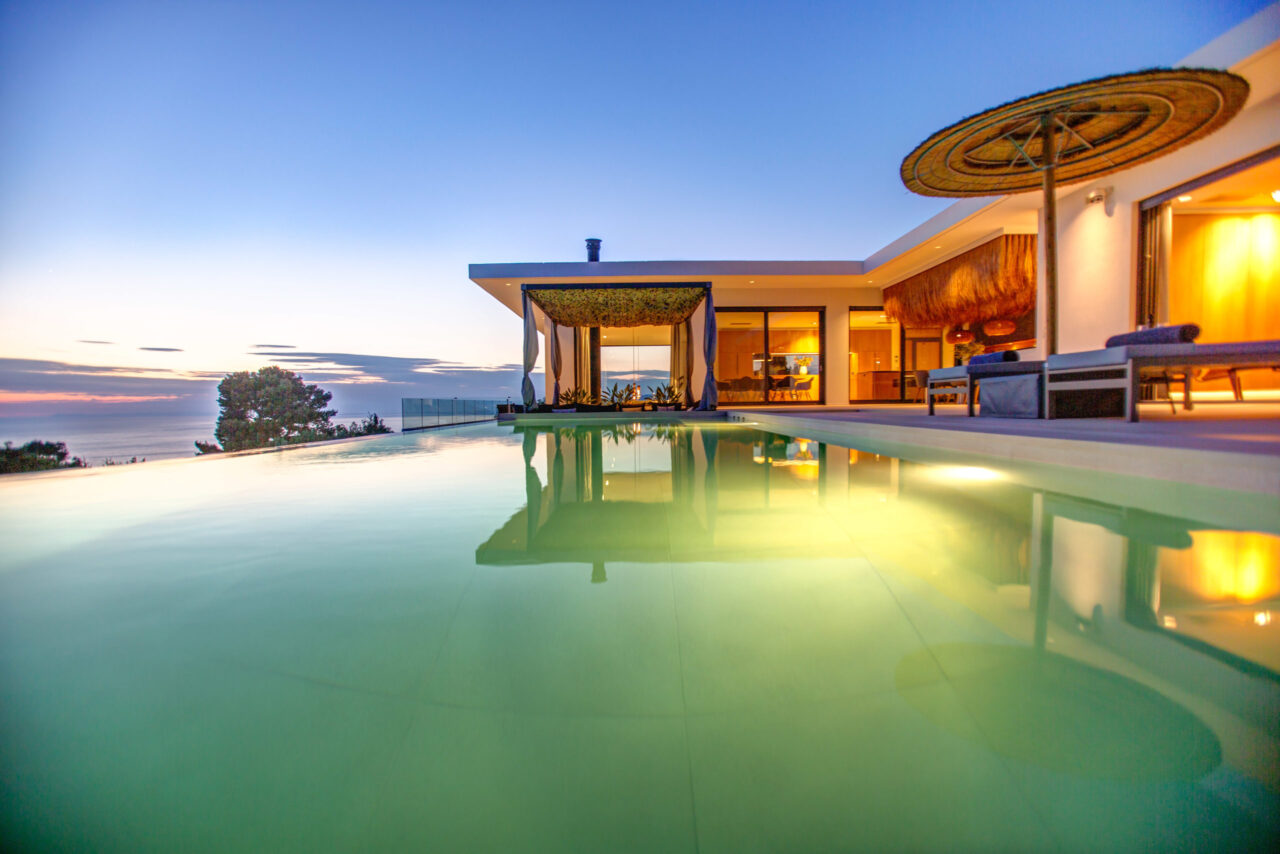 Eine 170 m² große Terrasse mit beheiztem Infinity-Pool, Hottub und gemütlichen Loungebereichen. Der perfekte Ort, um den Tag mit einem Sundowner und Meerblick ausklingen zu lassen.