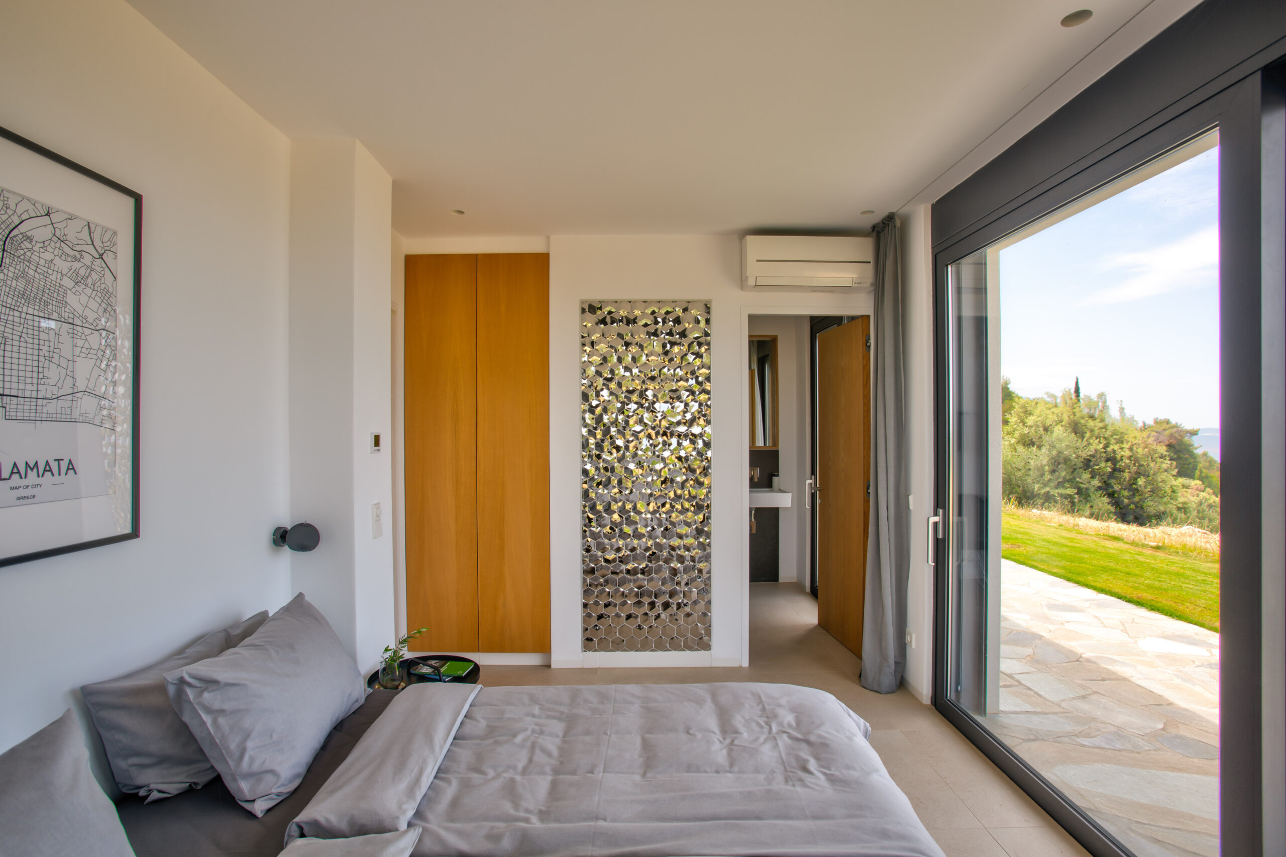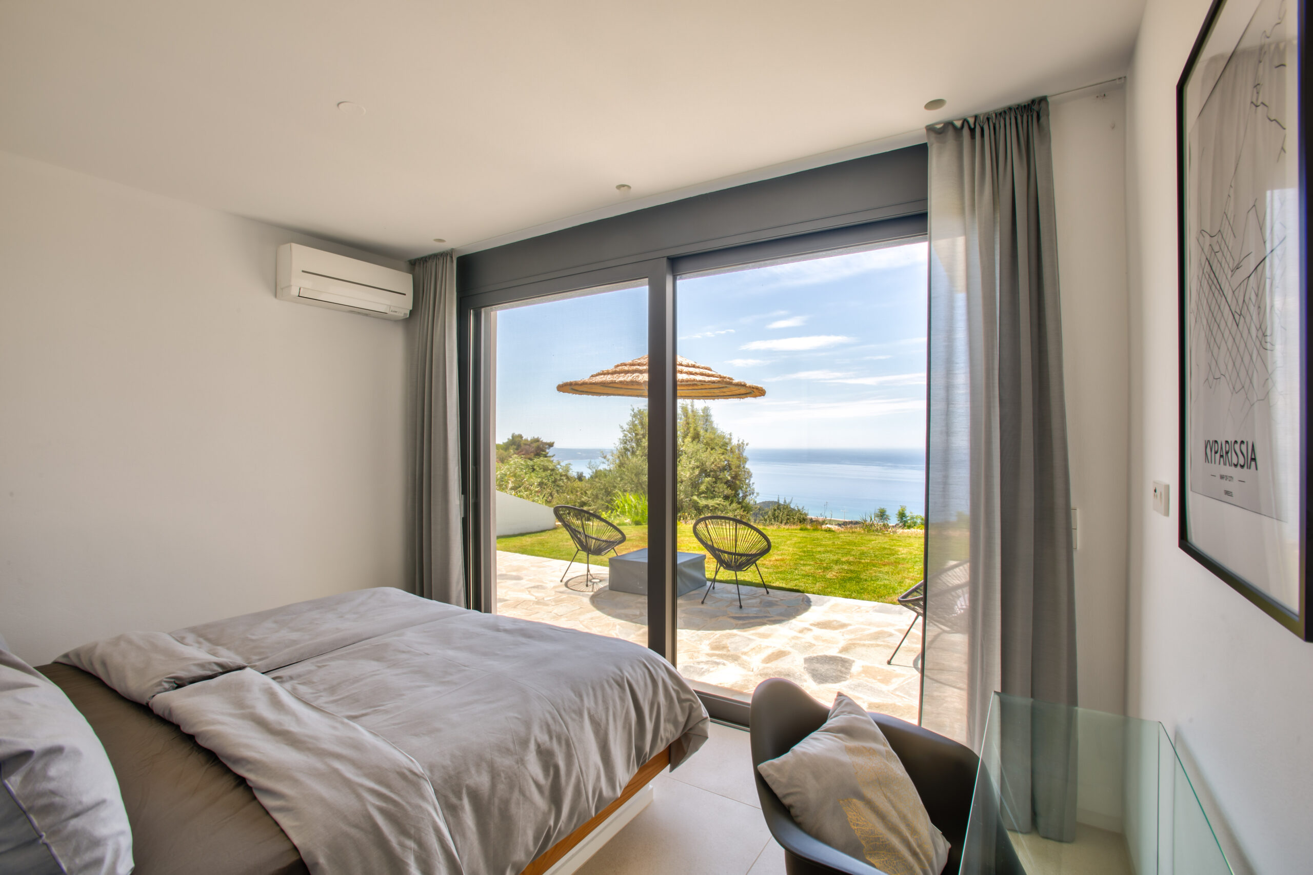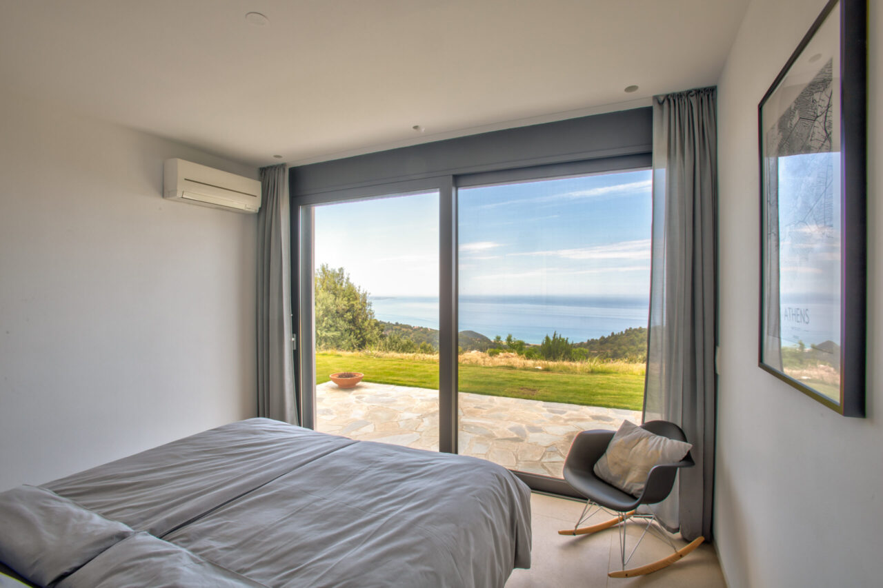 Ein einladendes und ruhiges Schlafzimmer mit Zugang zur separaten Terrasse und einem wunderschönen Blick in den Garten und auf das Meer.