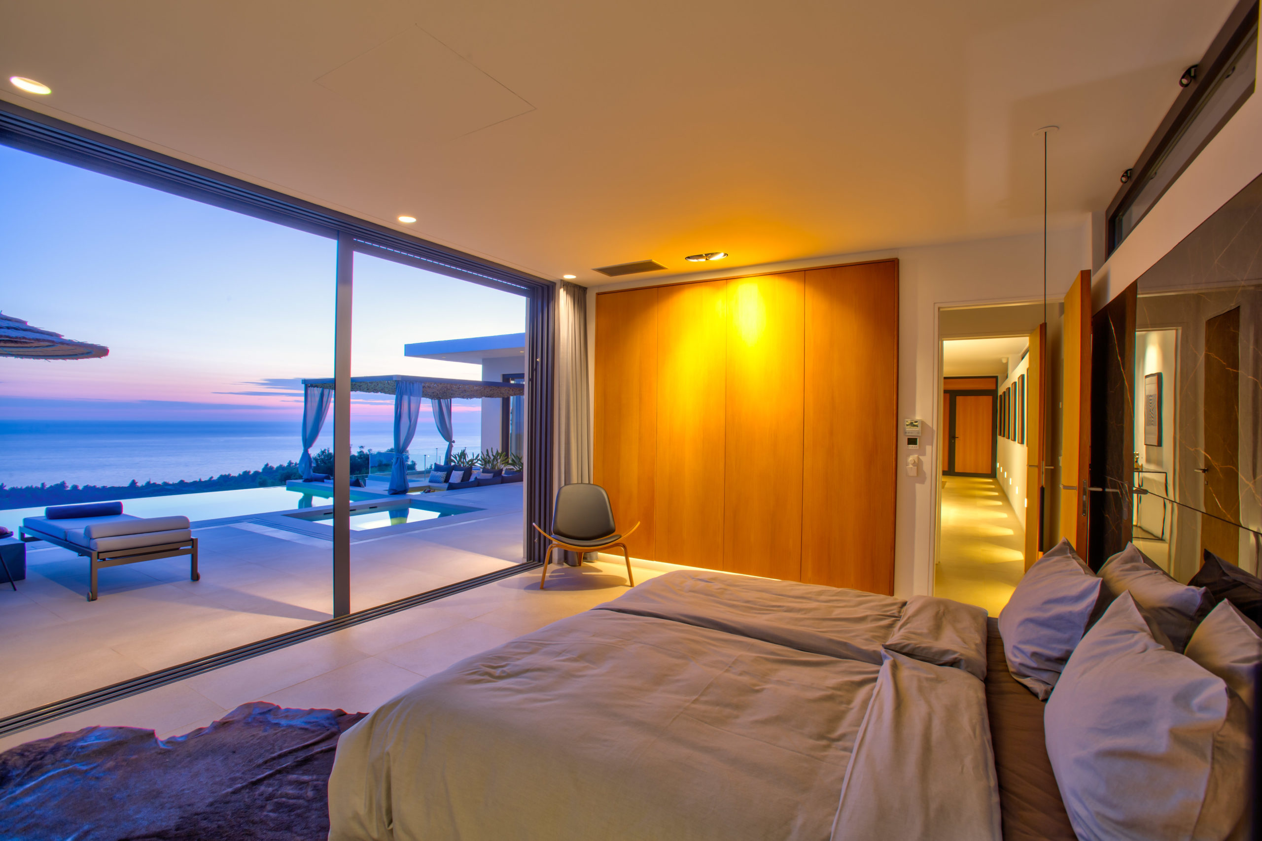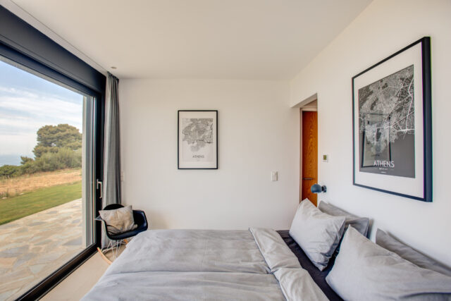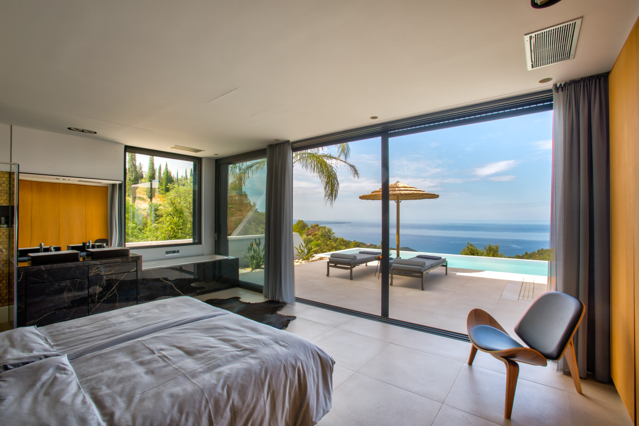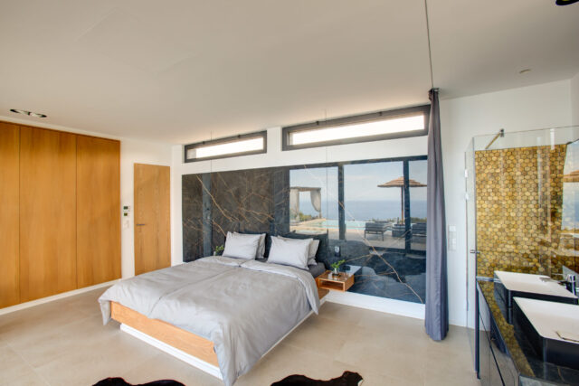 Das geräumige Hauptschlafzimmer mit direktem Terassenzugang. Genießen Sie den atemberaubenden Blick auf das Meer sogar von der Dusche oder der freistehenden Badewanne aus.