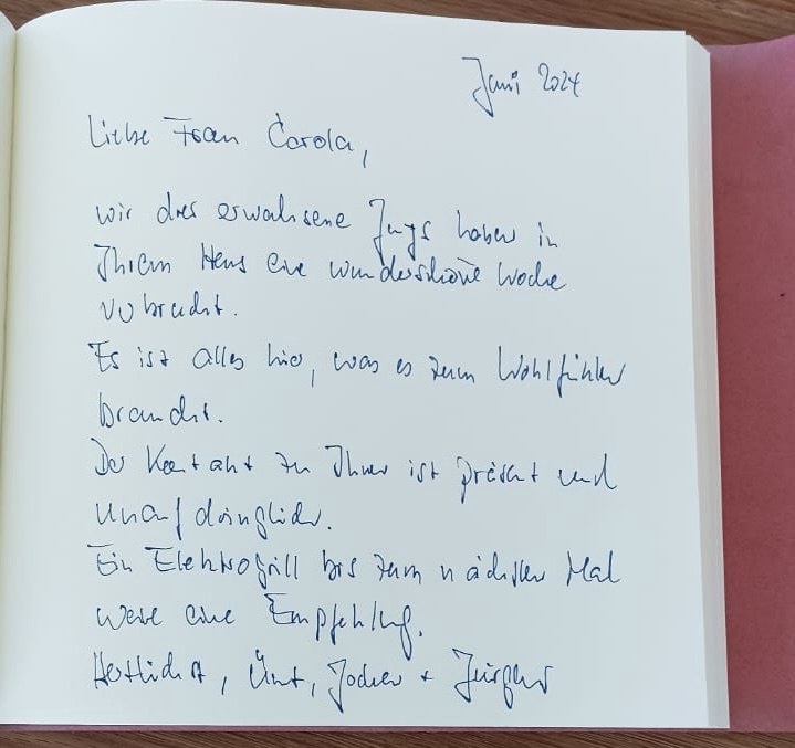 „Es war alles so perfekt und unkompliziert mit der Gastgeberin, gerne hätten wir Carola persönlich getroffen (oder besser kennengelernt). Bis ins kleinste Detail ist alles stimmig komponiert. Es gibt nichts, was im Haus oder in der Küche fehlt (anders als bei uns). Das morgendliche Aufwachen der Hammer! (Auch anders als bei uns…)“